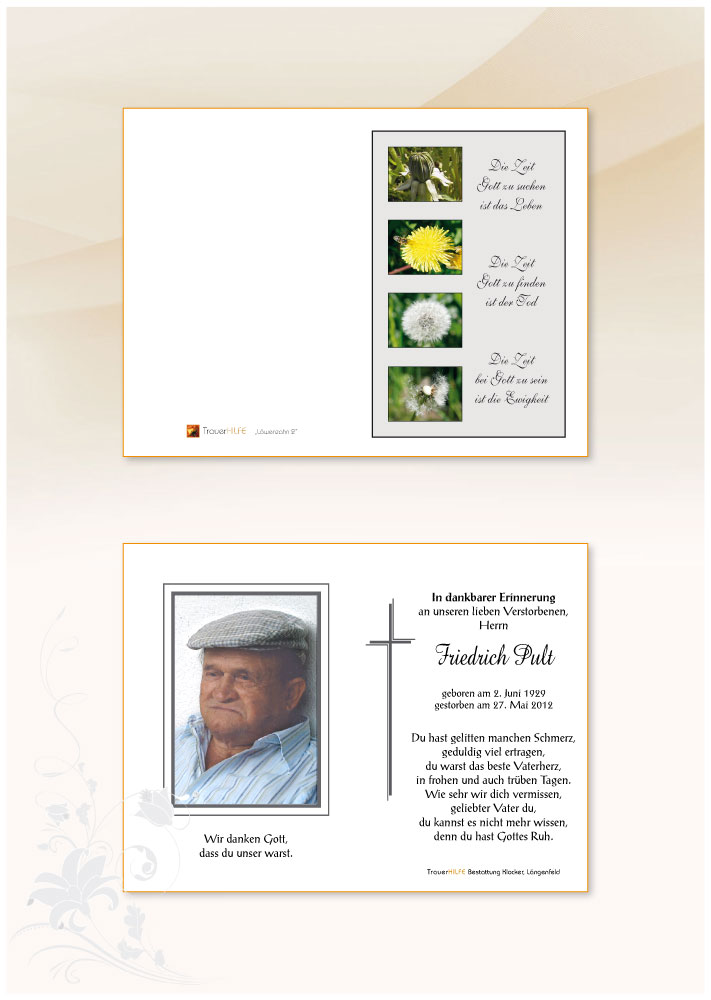 Ich gehe Euch vorausin den ewigen Frieden des Herrn und erwarte Euch zum ewigen Wiedersehen.Gottes Wille ist geschehen.