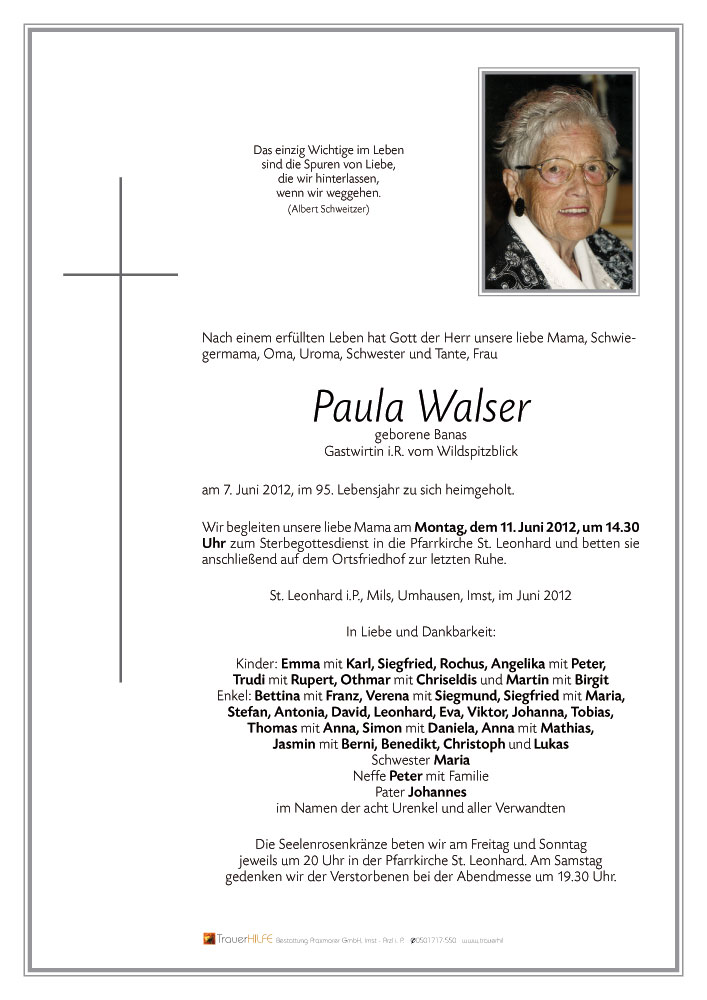 Die Mutter wars, was bedarfs der Worte mehr. Herzliches Beileid entbieten Dir Trudi mit Familie. Christl ( Vlbg.)</p>