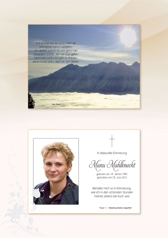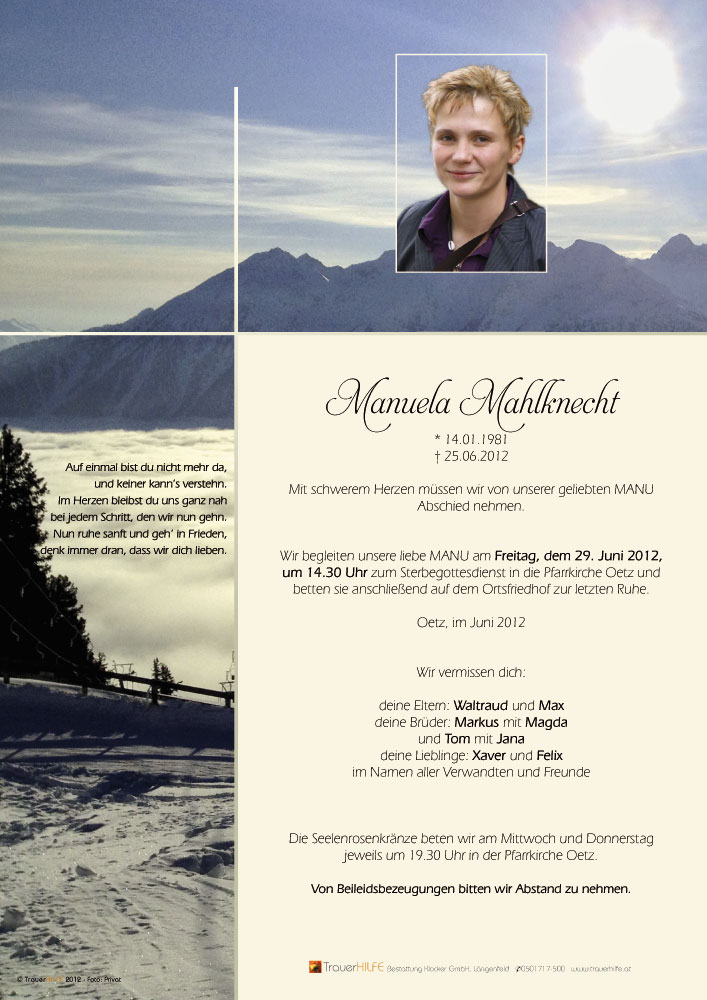 Allen, die Manu in Liebe oder Freundschaft nahe standen unsere Aufrichtige Anteilnahme.28.06.2012 23:17 - Vroni & Fritz Gufler