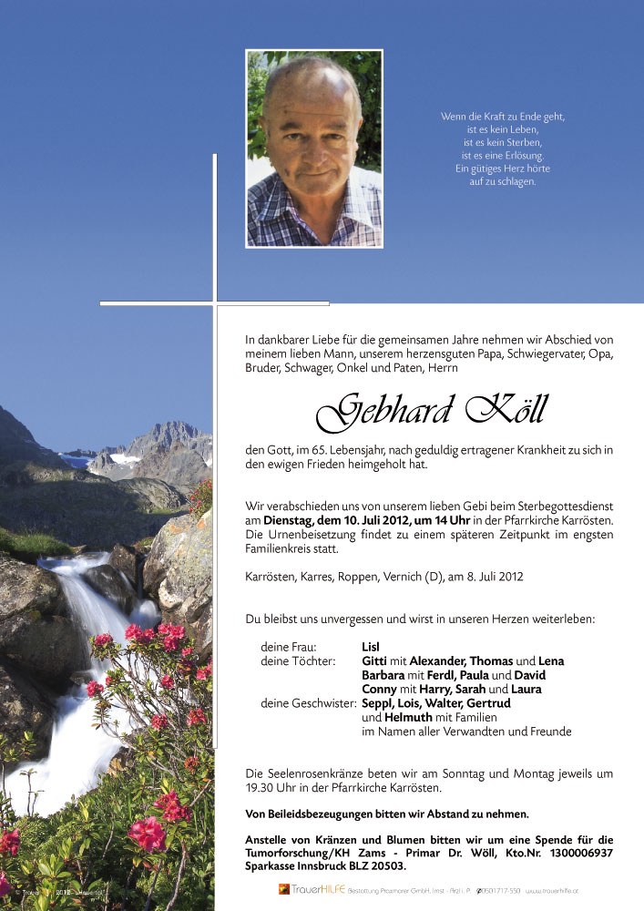 Es ist schwer, passende Worte des Trostes über den Tod von Gebi zu finden. Niemand kann euch den großen Schmerz abnehmen, den ihr gerade fühlt. Gebi war immer ein hilfsbereiter Mensch und für die Familie da. Selbst in der Zeit seiner schweren Krankheit hat er versucht mit viel Liebe und Kraft für seine Familie und sein Umfeld da zu sein. Die Frage "Warum" wird immer bleiben.
