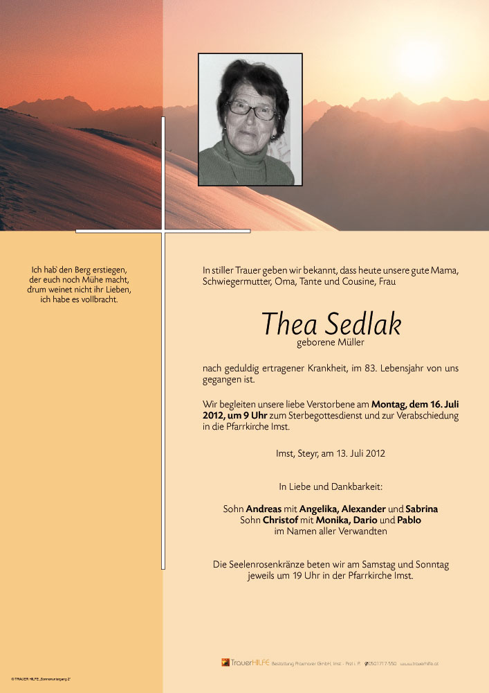 Erst heute vom Heimgang von Thea erfahren,erinnern wir uns an die schönen Stunden (Bergtouren) die wir mit ihr verbracht haben.Wir gedenken Ihrer im Gebet.