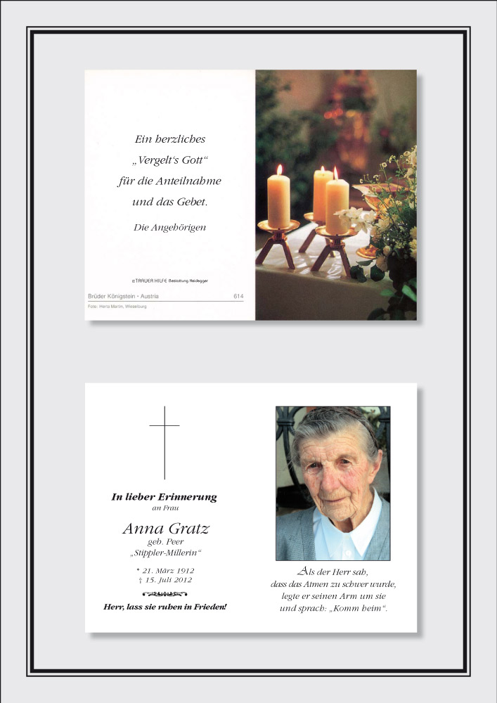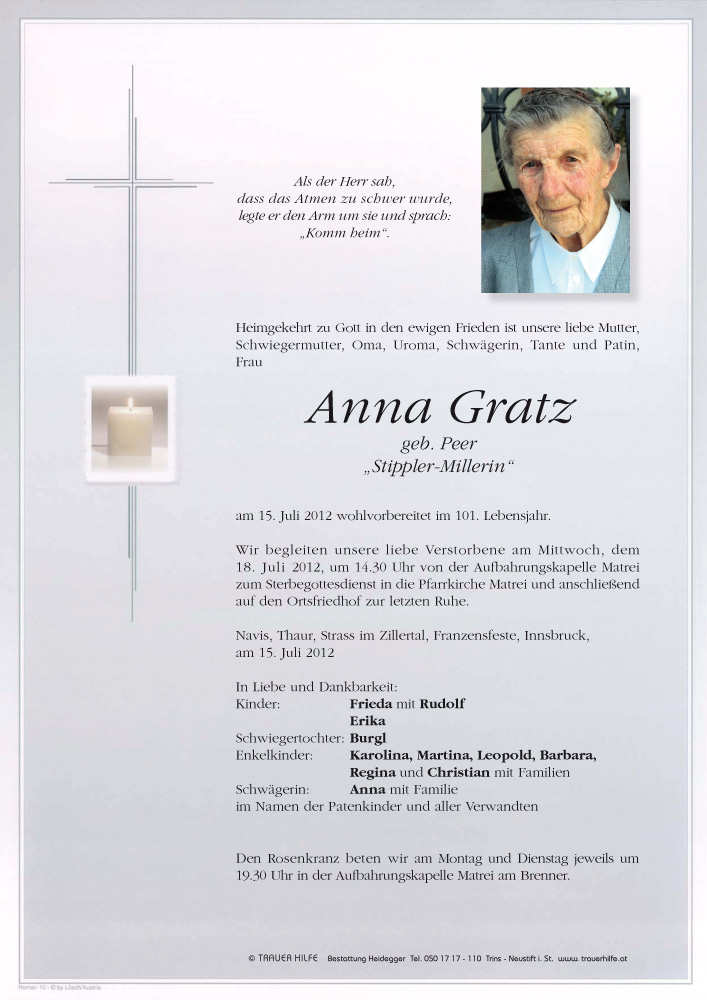 Bestattung wurde durchgeführt von: Karl Neurauter Karl Neurauter Bestattung Heidegger Brennerstraße 69 6150 - Steinach am Brenner Tel.: 05275 5211 zum Bestatter