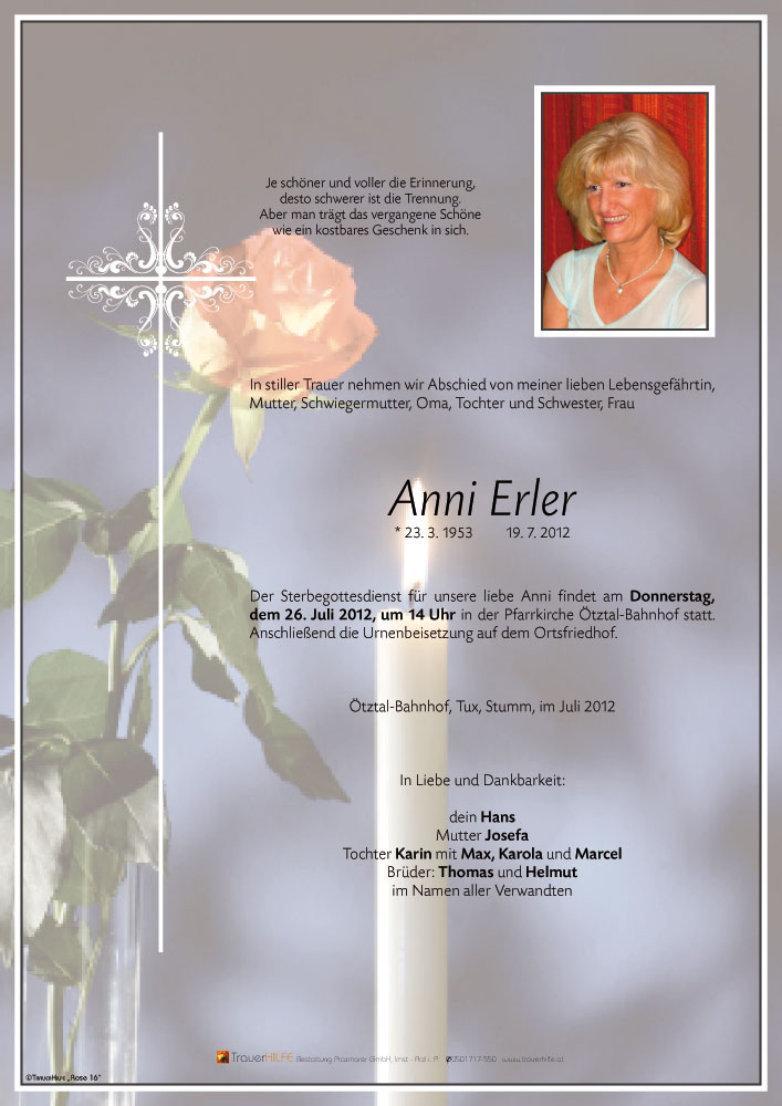 Diese Nachricht macht mich sehr betroffen, auch wenn ich Anni viele Jahre nicht mehr gesehen habe. Ich erinnere mich noch so gut und gern an unsere gemeinsame Volksschulzeit in Tux, deine Fröhlichkeit, dein Lachen....und dein Jodeln...damals schon....vor so vielen Jahren
