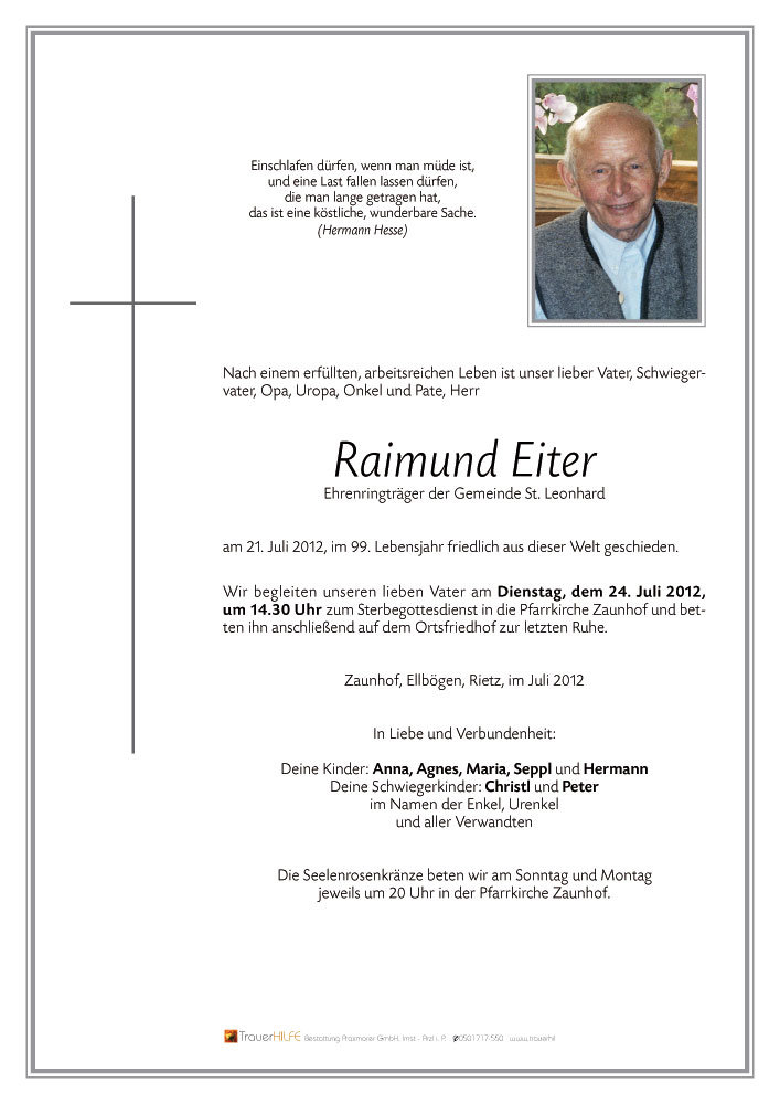 Zum Heimgang Eures lieben Raimund möchten wir Euch unsere Anteilnahme