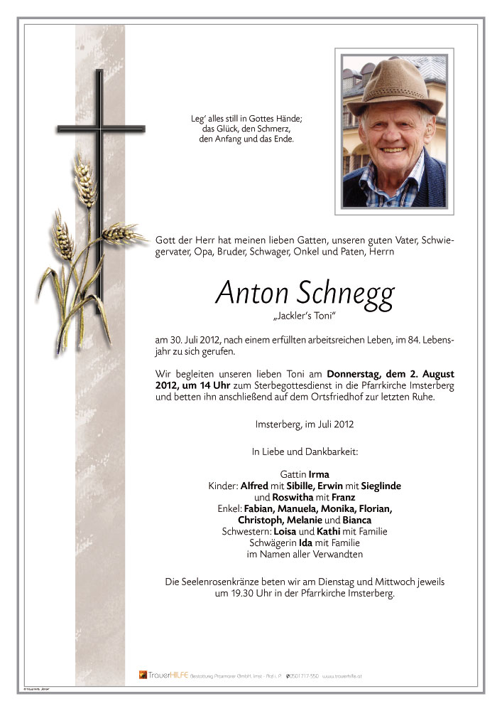 wir haben gestern vom Ableben Eures Vaters und Großvaters gehört. Onkel Toni war immer ein liebenswerter, aufrichtiger Mensch, der mit seinem Holder-Traktor oft in Spadegg vorbeifuhr. Er wird uns immer in guter Erinnerung bleiben.