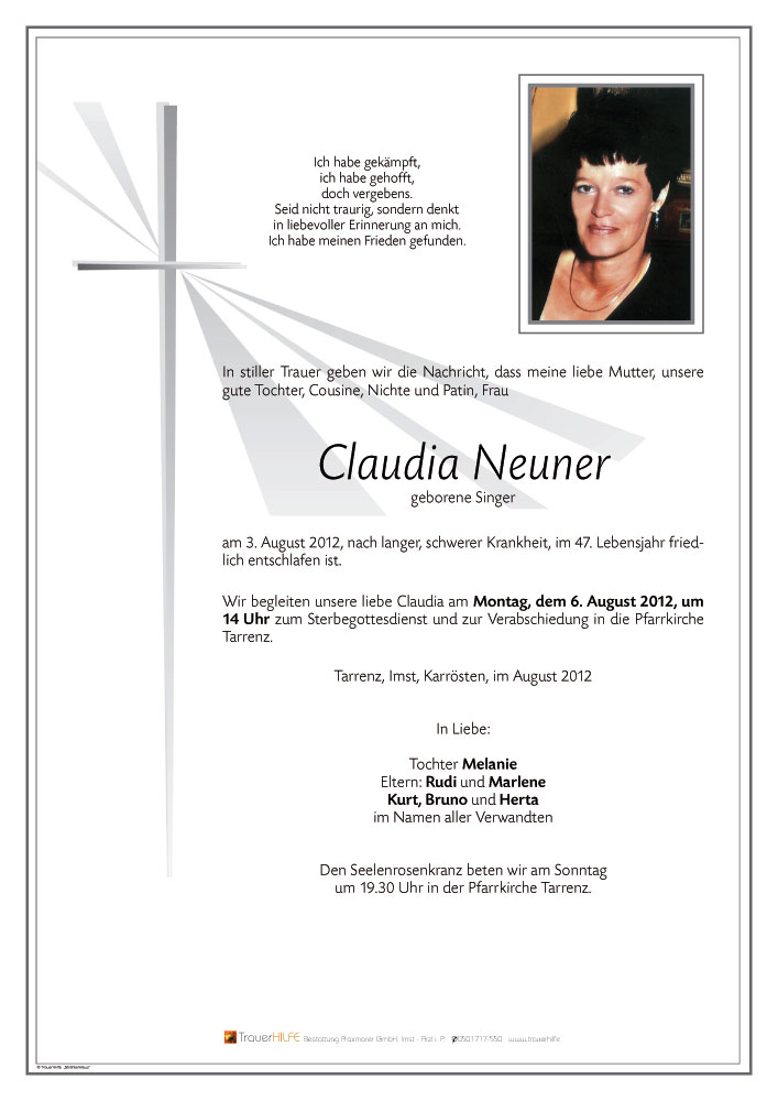 erst heute habe ich vom Tod Claudias erfahren - ich möchte euch mein herzliches Beileid ausdrücken. Ein Kind zu verlieren ist immer schwer - ich wünsche euch und Melanie viel Kraft.