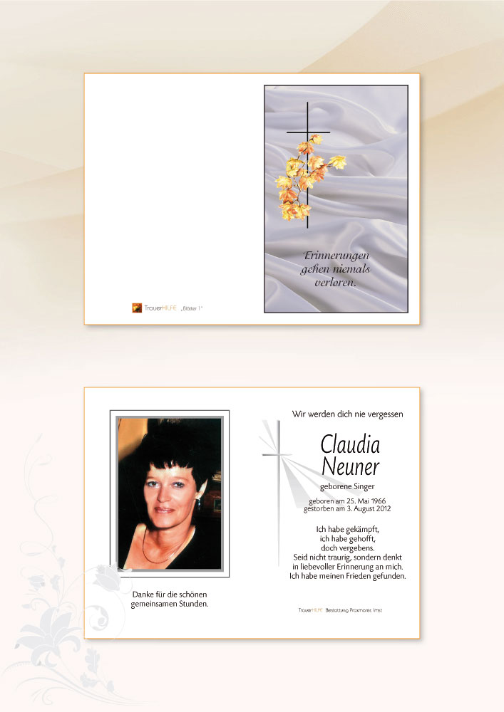 Du warst schon als kleines Kind ein unglaublich starkes Mädchen, das damals die Krankheit seiner Mutter sehr gut aufgenommen hat. Ich hoffe, dass du auch heute noch sehr viel von dieser Stärke besitzst, denn in dieser schweren Zeit wirst du viel davon brauchen!!! Ich wünsche dir viel Kraft und entbiete dir hiermit mein aufrichtiges Beileid.