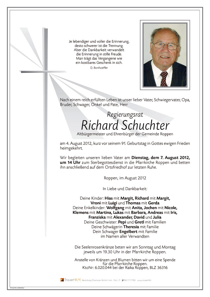 Leider kann ich bei der Beerdigung von Alt.Bgm. Richard Schuchter nicht anwesend sein.