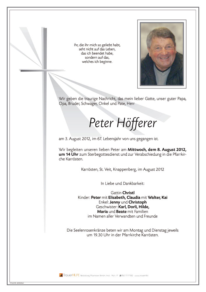 Liebe Christl, lieber Kai, wir wünschen euch viel Kraft und Zusammenhalt in dieser schweren Zeit - wir werden die fröhliche Art von Peter nie vergessen05.08.2012 16:58 - Mayrhofer, Karres