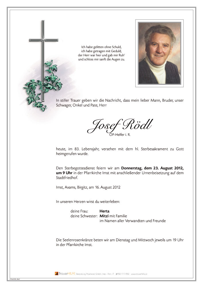 Bestattung wurde durchgeführt von: Daniel Klocker Bestattung Praxmarer GmbH Thomas Walch Str. 4 6460 - Imst Tel.: 05412 64250 zum Bestatter
