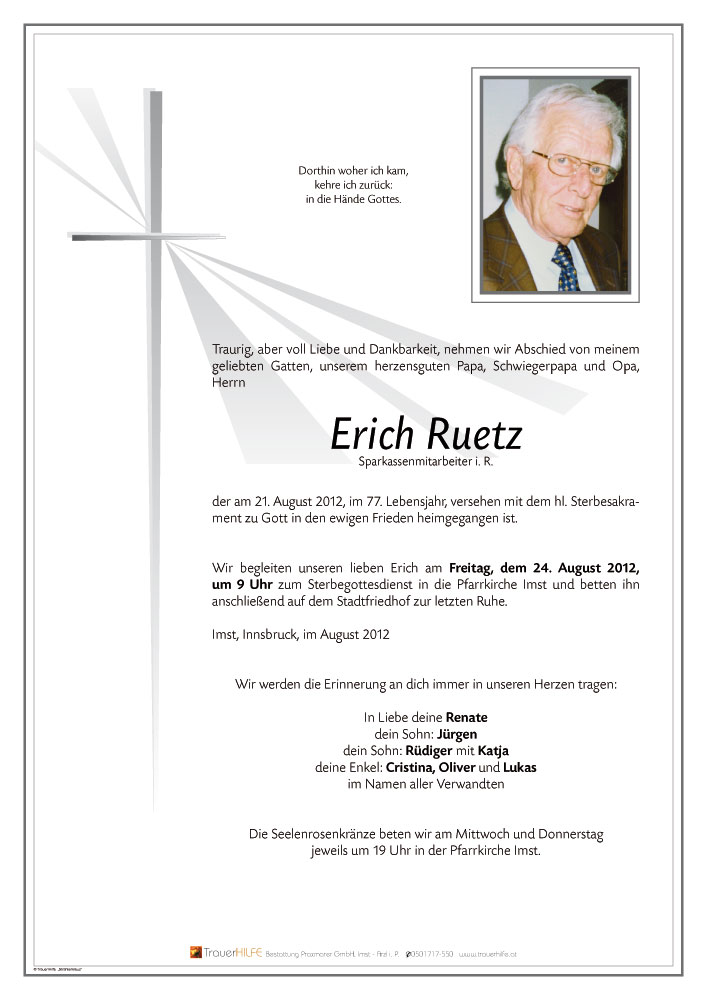 Gestern fiel mir eine alte Bankunterlage mit der Handschrift Ihres Mannes und eures Vaters in die Hände, umso betroffener war ich, als ich jetzt die Todesanzeige sah.