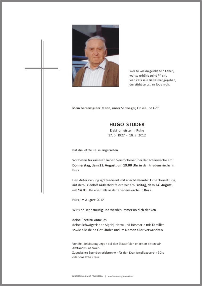 Bestattung wurde durchgeführt von: Christoph Feuerstein Bestattung Christoph Feuerstein Sturnengasse 26 6700 - Bludenz Tel.: 05552 62079-0 zum Bestatter