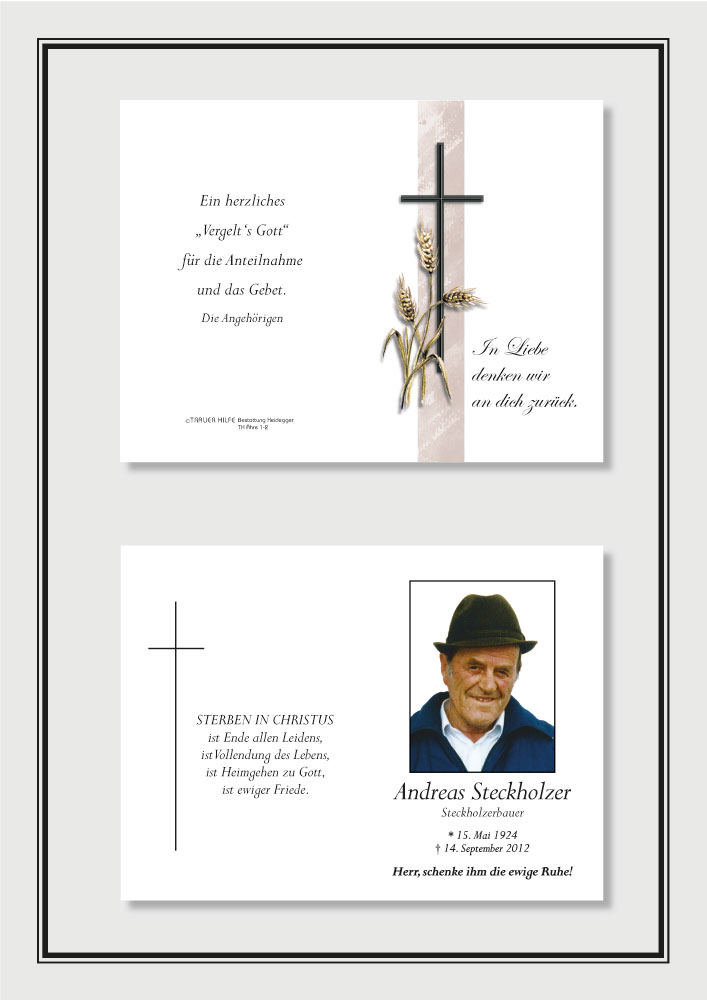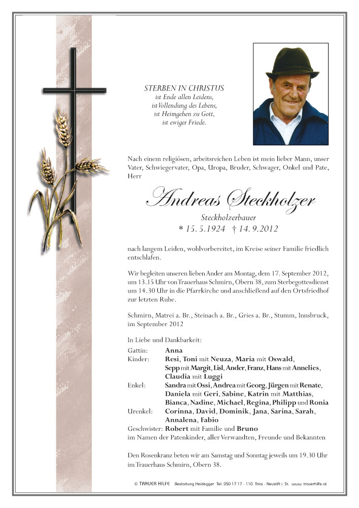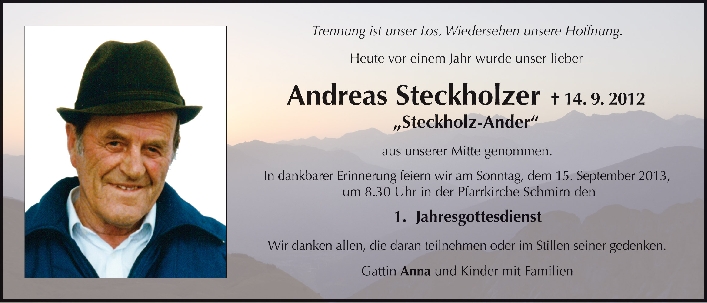 • Liebe Familie Steckholzer, ich las rein zufällig 03.10.2012 im Internet, dass Ihr geliebter Mann -Frau Steckholzer-, Euer Vater, Euer Großvater und Euer Urgroßvater am 14.09.2012 nach langer Krankheit verstarb. Trotz der riesigen Trauer und dem Schmerz in Ihrer und Euer Familie über den riesigen Verlust eines geliebten Menschen, hatte Ihr Mann -Frau Steckholzer-, Euer Vater, Euer Großvater und Euer Urgroßvater dennoch ein sehr erfülltes Leben als erfolgreicher und engagierter Bauer mit 9 prächtigen Kindern, 12 Enkeln und 8 Urenkeln. Auf der anderen Seite hinterläßt ein verstorbener Mensch immer eine riesige Lücke innerhalb der Familie. Dies ist wiederum die Chance, dass alle Familienangehörige in Zukunft näher zusammenrücken. Aufgrund der Erinnerungen wird Andreas Steckholzer innerhalb Ihrer Familie weiterleben. Wie heißt es schon in dem Lied von Trude Herr: "Niemals geht man so ganz, irgendwas von mir bleibt hier". Auch wenn ich leider seit 22 Jahren nicht mehr im schönen Schmirntal war, habe ich stets gute Erinnerungen an Ihre und Eure Familie. Viele Grüße und herzliches Beileid sowie einen besonderen Gruß an Claudia von