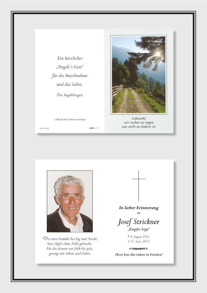 Bestattung wurde durchgeführt von: Karl Neurauter Karl Neurauter Bestattung Heidegger Brennerstraße 69 6150 - Steinach am Brenner Tel.: 05275 5211 zum Bestatter