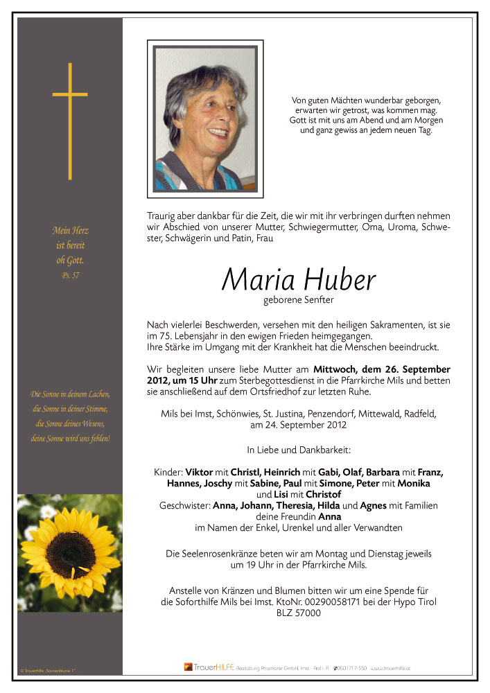 mit deinem Tod verlieren wir vieles, nur nicht die schöne Zeit mit dir. Wir danken dir dafür.25.09.2012 20:12 - Fam. Gasser Bertl und Erna
