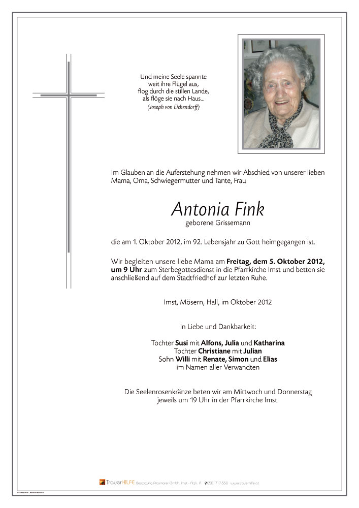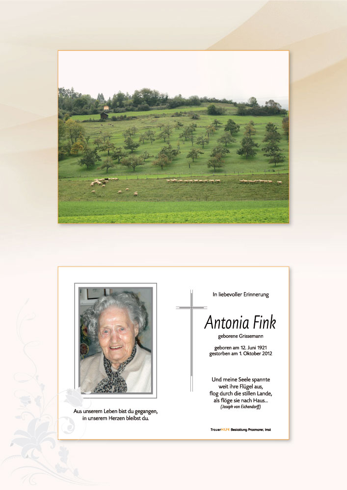 Ich gehe Euch voraus in den ewigen Frieden des Herrn und erwarte Euch zum ewigen Wiedersehen.Gottes Wille ist geschehen.