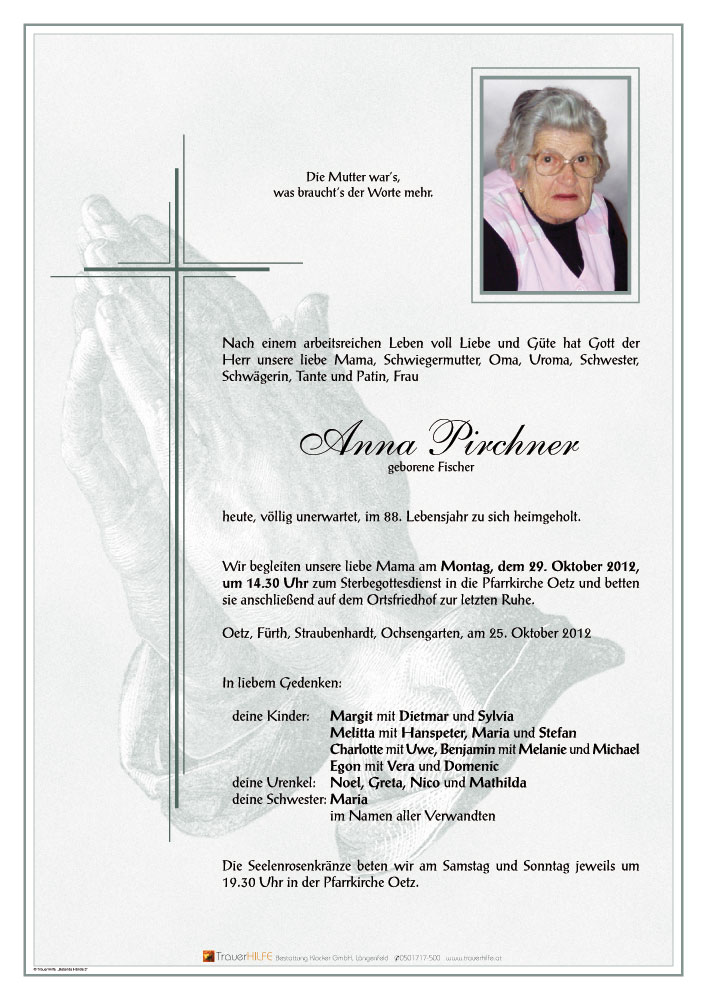 Aufrichtiges Beileid wünschen die Bauersleut Roswitha und Peter28.10.2012 14:20 - Fam. Sonnweber