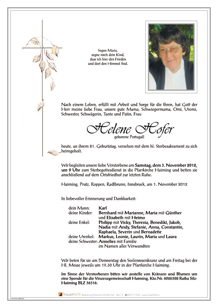 Lieber Karl, liebe Trauerfamilie. Wir sind in den Stunden der Trauer um Helene bei Euch. Sie wird uns als engagierte Chronistin und guter Mensch in Erinnerung bleiben.