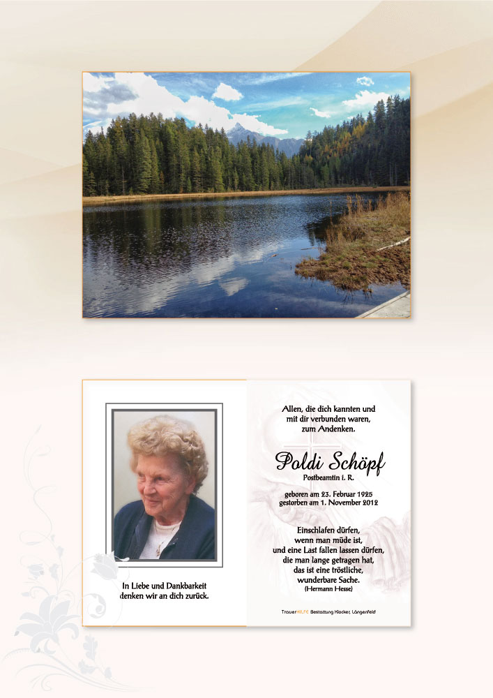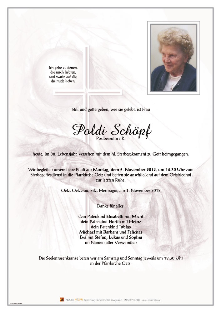 Viele schöne Erinnerungen an Eure Tante Poldi und viel Kraft in dieser schweren Zeit des Abschiednehmens.