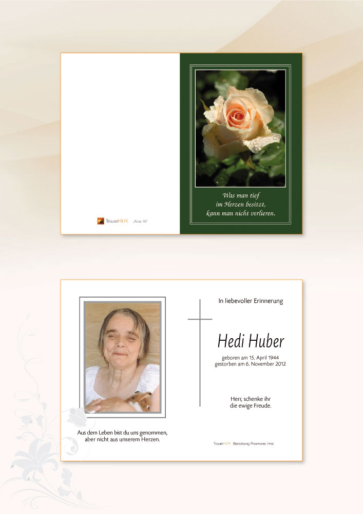 Wenn wir dich besuchten, hast du dich immer sehr gefreut. Aber wenn der Besuch zu Ende war, hast du dich mit einer Leichtigkeit sondergleichen verabschiedet. Sich über den Augenblick freuen und jederzeit Abschied-Nehmen können, das und vieles mehr hast du uns vorgelebt. Danke, Hedi! Dein Schwager Franz
