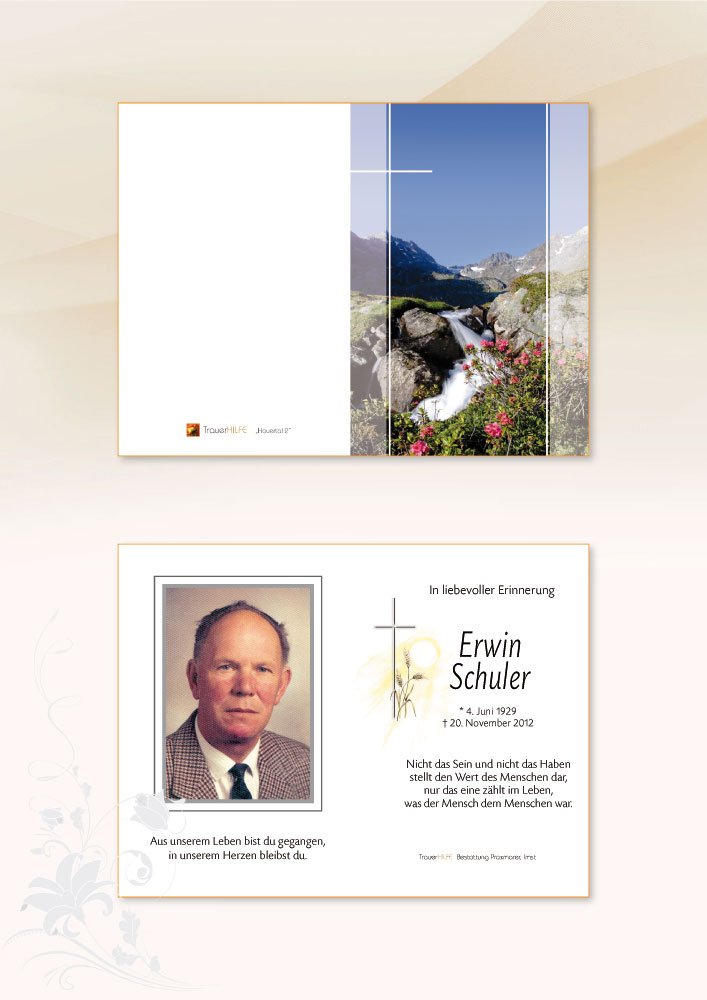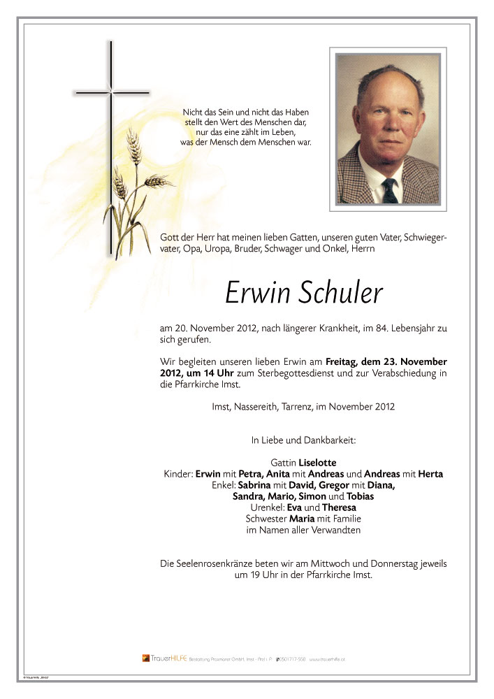 Ich gehe Euch vorausin den ewigen Frieden des Herrn und erwarte Euch zum ewigen Wiedersehen.Gottes Wille ist geschehen.