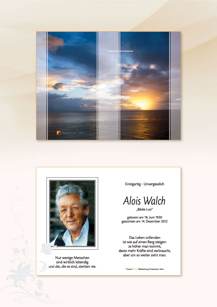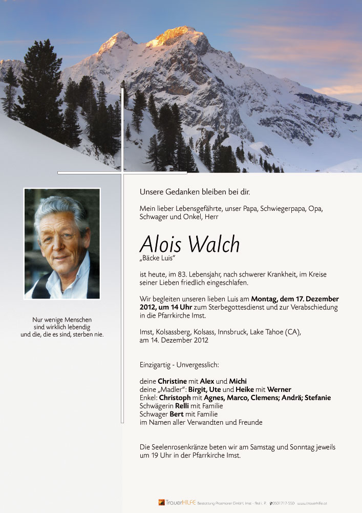 Alois hatte viele Träume, kühne Träume. Und er hatte das Glück zu erleben, wie viele seiner Träume Wirklichkeit wurden. Ich wünsche Euch, dass diese Gewissheit Euch hilft, den Schmerz, den ich mit Euch empfinde, zu tragen.03.01.2013 16:45 - Helga Geson