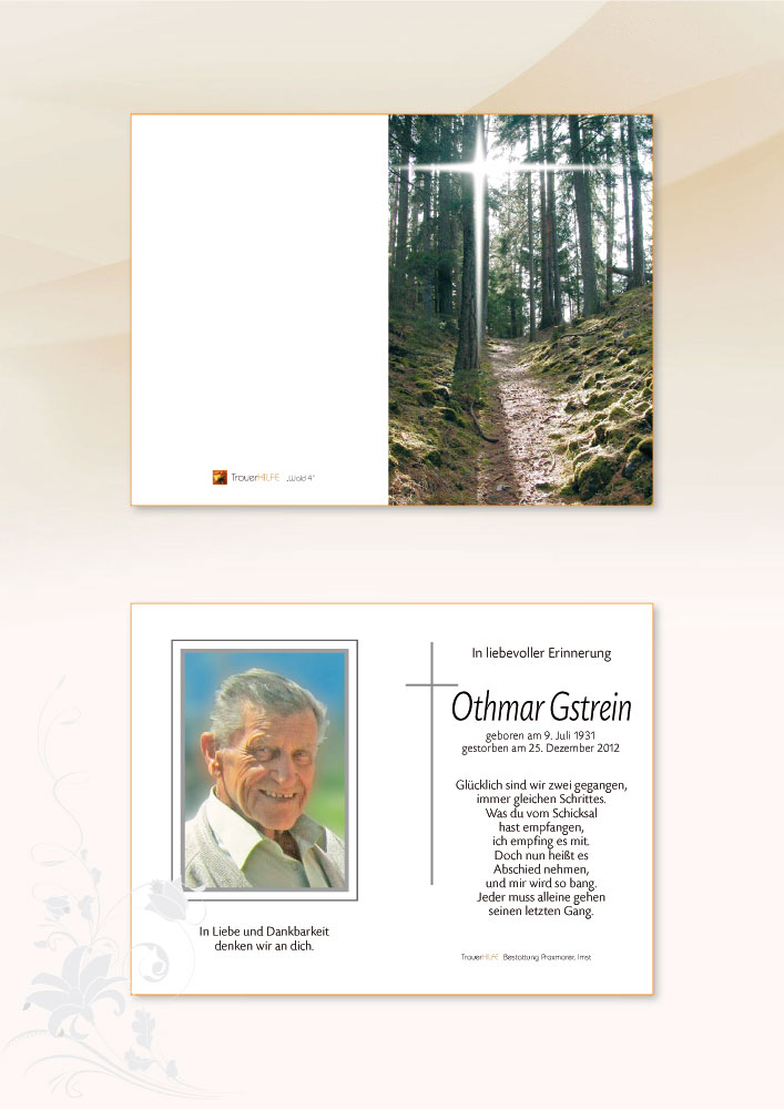 Was du uns im Leben hast gegeben,dafür ist jeder Dank zu klein.Du hast gesorgt für deine Lieben,von früh bis spät, tagaus, tagein.Du warst im Leben so bescheiden,nur Pflicht und Arbeit kanntest du.Mit allem warst du stets zufrieden,nun schlafe sanft in stiller Ruh.