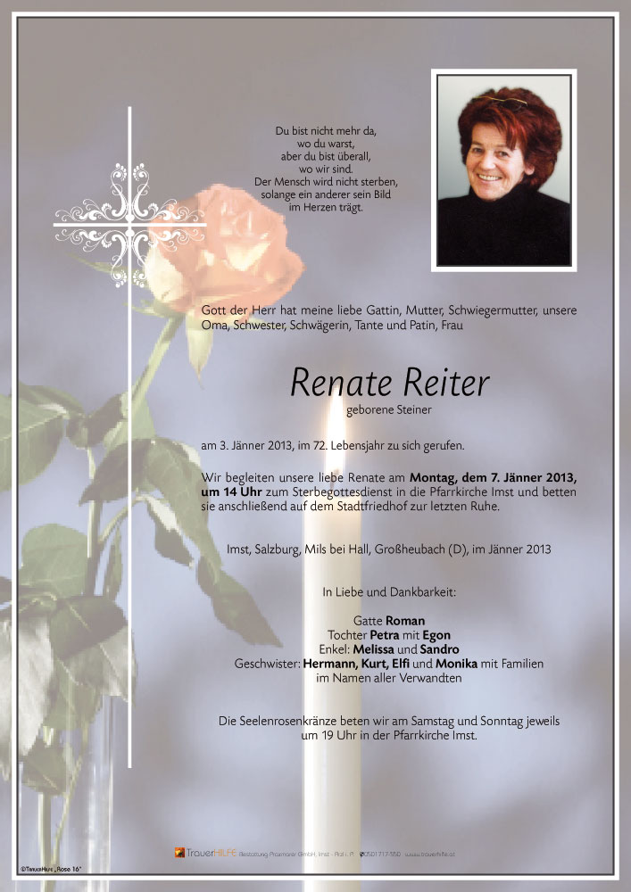 Herzliches Beileid zum Ableben eurer Renate.Wir wünschen euch Kraft in dieser schweren Zeit.05.01.2013 11:38 - Anita&Wolfgang Tinkl aus Reutte