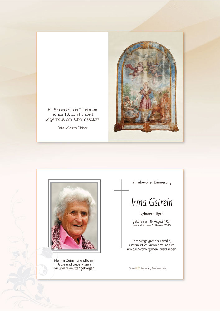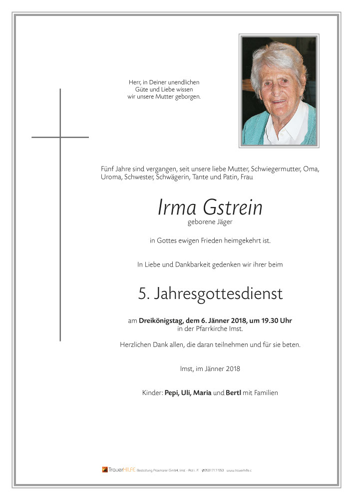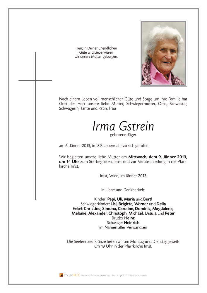 Betroffen von der Nachricht über das Ableben von Irma dürfen wir unsere herzliche Anteilnahme aussprechen.