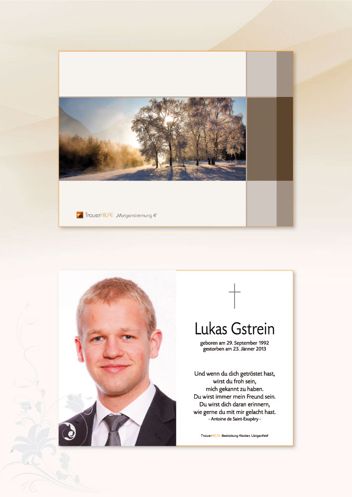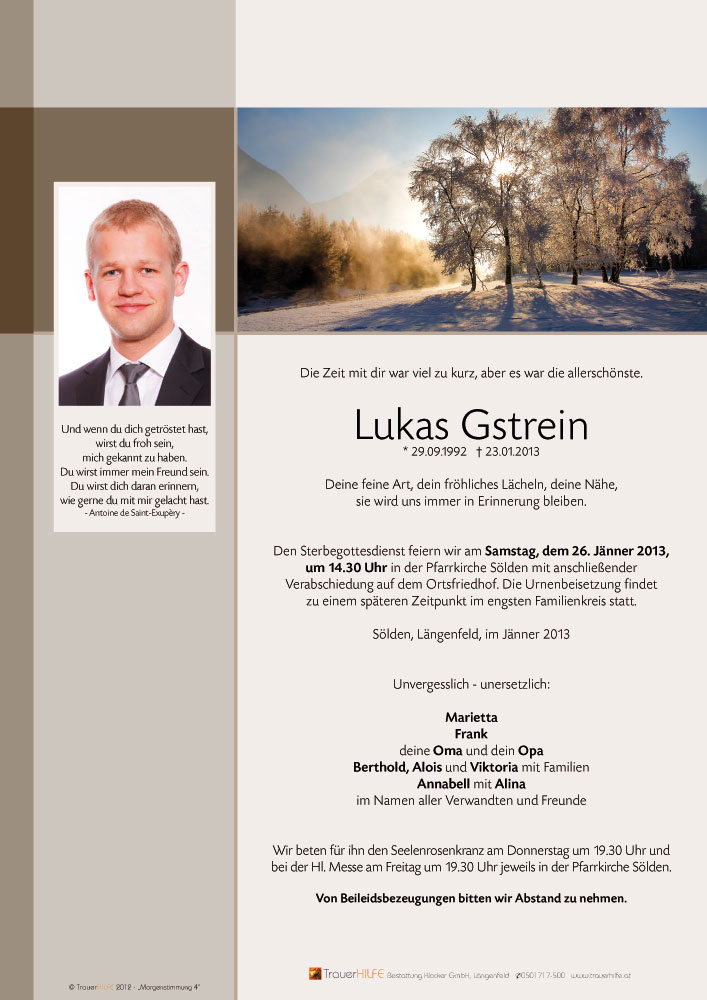Liebe Familie von Lukas, mein Sohn ist auch an einem 23. verunglückt- am 23. Oktober 2011- zwei Tage vor seinem 18. Geburtstag. Ich weiß, wie Sie sich fühlen, welche Schmerzen Sie empfinden! Als ich die Todesnachricht von Lukas gelesen habe, erlebte ich diesen schwärzesten Tag meines Lebens noch einmal... Mein Glaube daran, dass es meinem Sohn David im Himmel- wo immer der auch ist- gut geht, tröstet mich. Es tröstet mich auch, dass ich einen Engel mehr habe, der mich beschützt. Ich wünsche Ihnen von ganzem Herzen, dass auch Sie diesen Glauben haben können. Lukas wird immer bei Ihnen sein... In Gedanken und Gebet bei Ihnen! Karin W. Du fehlst uns so ...Wo früher dein Lachen war,ist jetzt nur noch Stille.Wo früher dein Platz war,ist jetzt nur noch Leere.Unfassbar ist die Erkenntnis,es wird sich nie mehr ändern.Wir werden dich vermissen,ein Leben lang.</p>