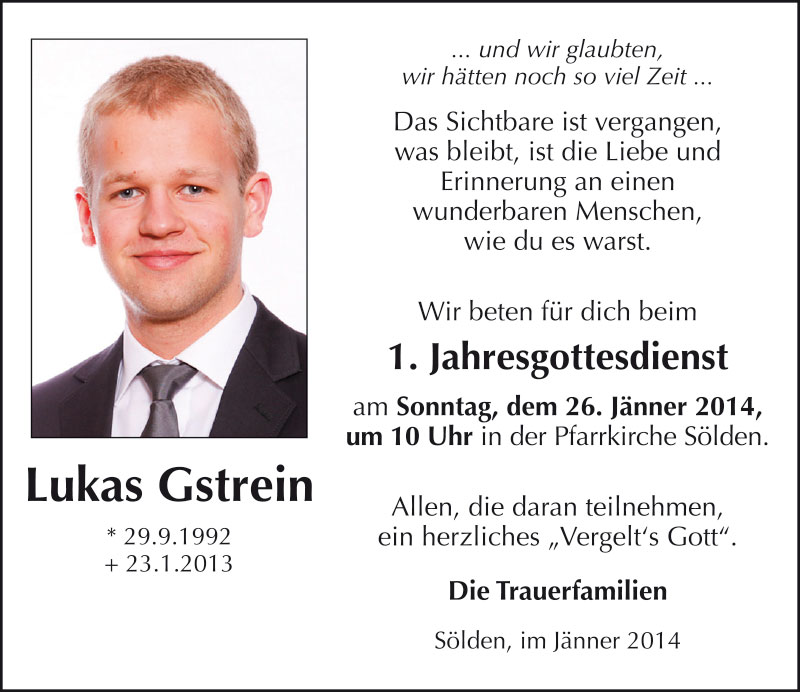 Ja Lukas jetzt ist es schon wieder a Jahr her.... noch immer ist es für deine Familie unbegreiflich.... Es tut noch weh . Immer wieder schauen wir die Fotos von dir an ..... Du bleibst in unserem Herzen mit deiner fröhlichen Art ...29.01.2014 07:14 - Anna Rosa Fender