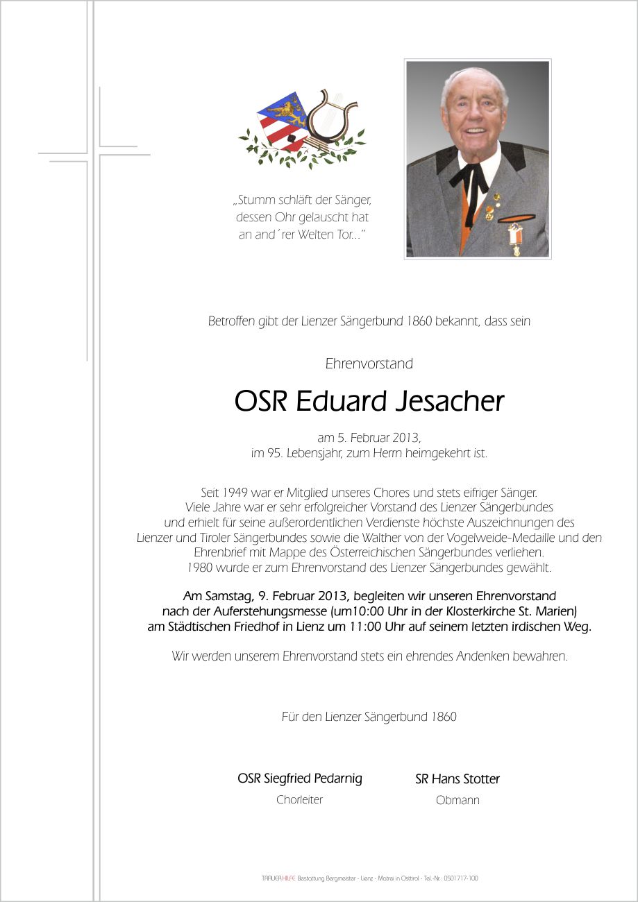 Lieber Edi - oft haben wir das Lied vom Sänger gemeinsam gesungen. Nun bist Du es, dessen Ohr and´rer Welten Töne lauscht. Danke für die netten Momente im Leben, die wir mit Dir erleben durften. Deine Stimme soll weiterklingen in den Herzen Deiner Lieben, denen ich mein tiefes Mitgefühl zu Deinem Heimgang zu Gott aussprechen darf. Lebe weiter in der Erinnerung und in Gottes ewigem Garten.