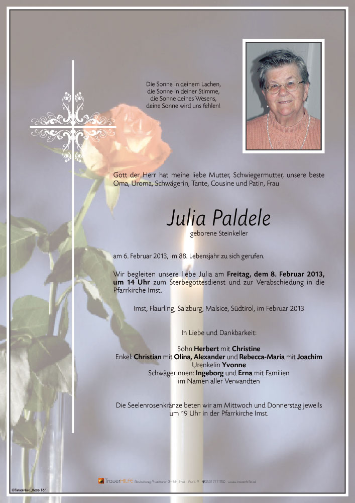 • Tief traurig nehmen auch wir Abschied von unserer Tante Juli. Jahrzehnte lang verband uns eine loses familiäres Zusammensein - schon in der Jugend aber auch viele Jahre später. In unzähligen Briefen waren wir stets in Verbindung in aller Welt. Wir werden sie immer in bester Erinnerung behalten.