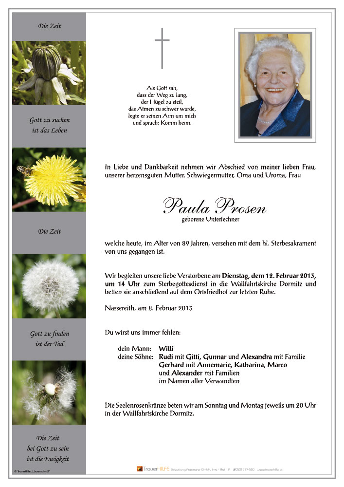 Mit Wehmut mussten wirlesen, dass deine liebe Frau und eure Mutter von euch gegangen ist.