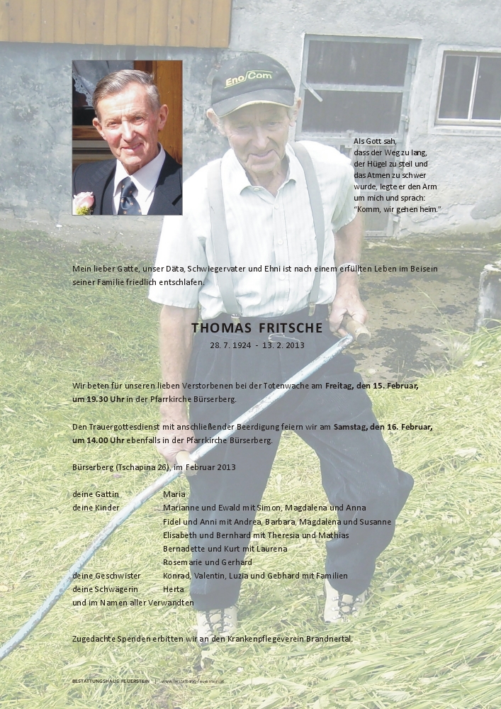 Bestattung wurde durchgeführt von: Christoph Feuerstein Bestattung Christoph Feuerstein Sturnengasse 26 6700 - Bludenz Tel.: 05552 62079-0 zum Bestatter