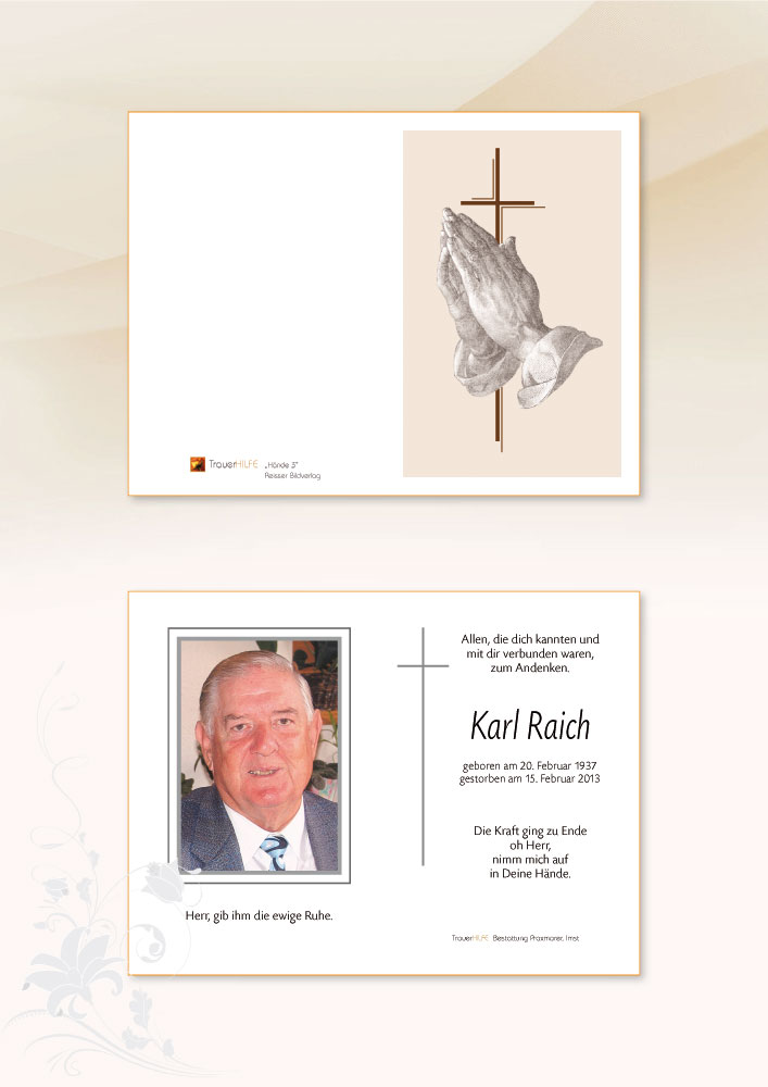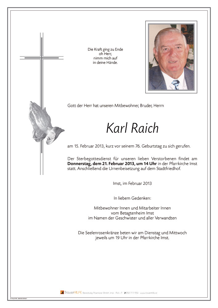 Meine aufrichtige Anteilnahme am Heimgang des Verstorbenen KArl Raich. Möge ihm der Herr alles lohnen, was er Gutes getan hat. Ich kannte ihn von den Gottesdiensten im Betagtenheim, den vielen Mopedfahrten unterwegs und dem gemeinsamen Mittagstisch mit Sepp Winkler. Ruhe in Frieden. Diakon Andreas
