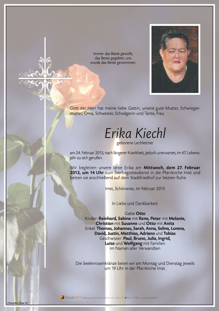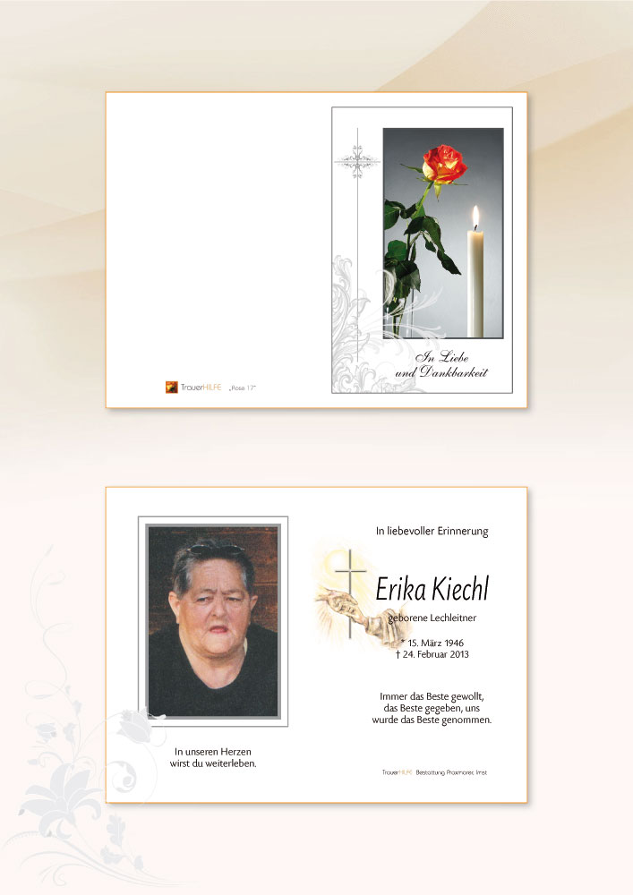 Immer das Beste gewollt,das Beste gegeben,uns wurde das Beste genommen,in meinem Herzen wirst du weiterleben. Mama ich Liebe dich und vermisse dich dein sohn Christian