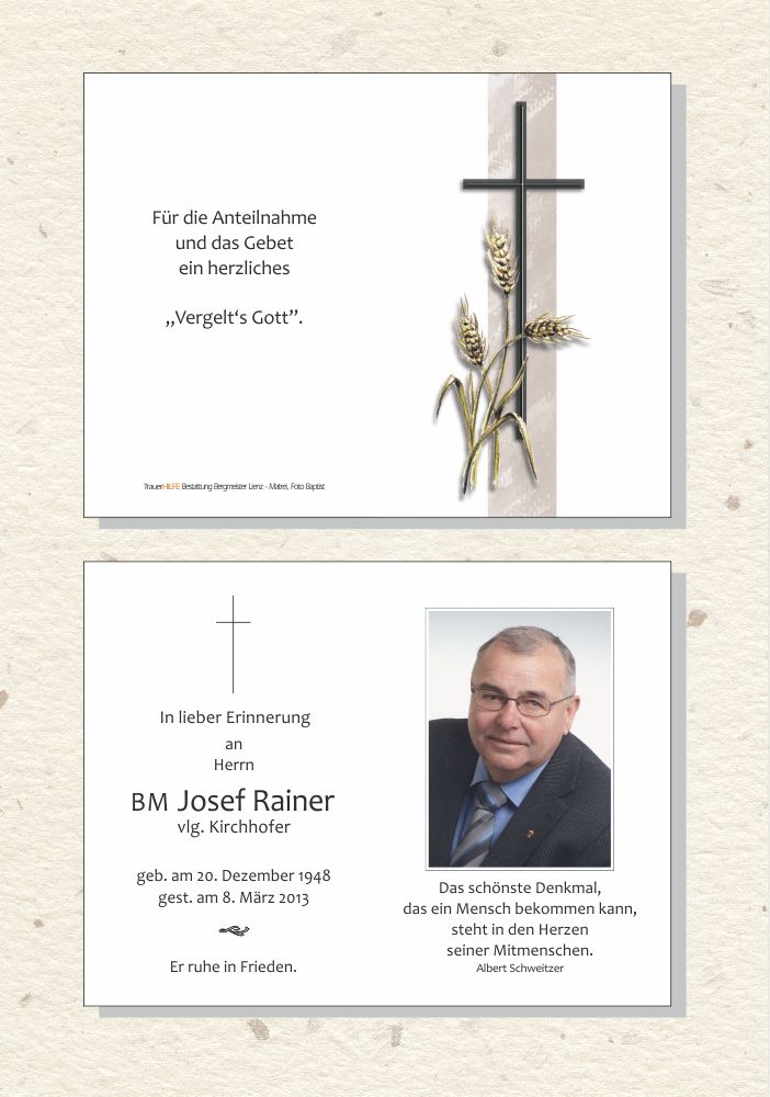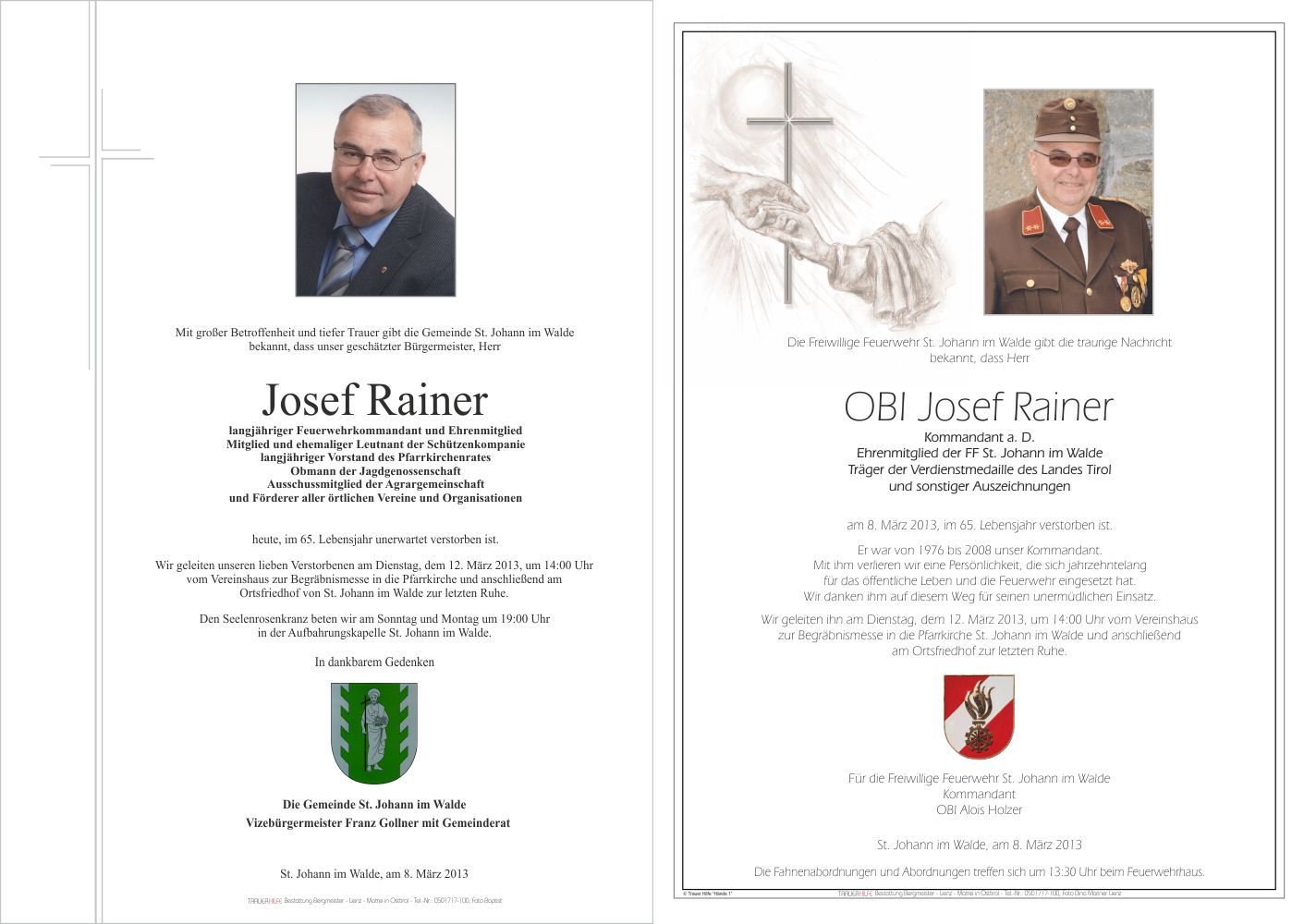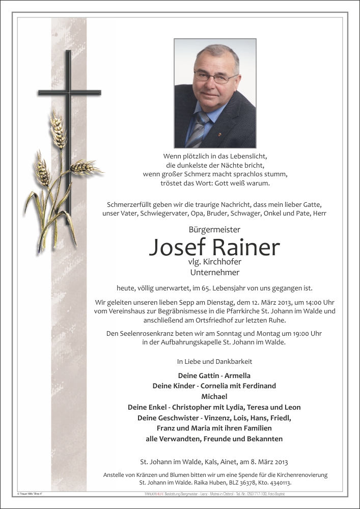 Ein Leben für die Menschen, denen Du ein Freund, Helfer, Visionär und starker Partner warst - als langjähriger Feuerwehrkommandant und als Bürgermeister. Jahrzehnte selbstlos und immer hilfsbereit im Dienst der Mitbürger zu stehen, verlangt Bewunderung und Dank. Du wirst nicht nur Deiner geliebten Familie fehlen, sondern allen, die Dich als immer freundlichen und auch humorvollen Kameraden und Kollegen kannten. Tot ist nur, wer auch in den Gedanken der Menschen nicht mehr vorkommt. Du, lieber Sepp, wirst über viele Generationen in den Gedanken nicht nur der engeren Familie sondern auch in Deiner Gemeinde und ganz Osttirol bleiben. DANKE für alles, was Du zum Wohle unserer schönen Heimat und ihrer Menschen getan hast. LEBE WOHL10.03.2013 20:08 - Robert Possenig