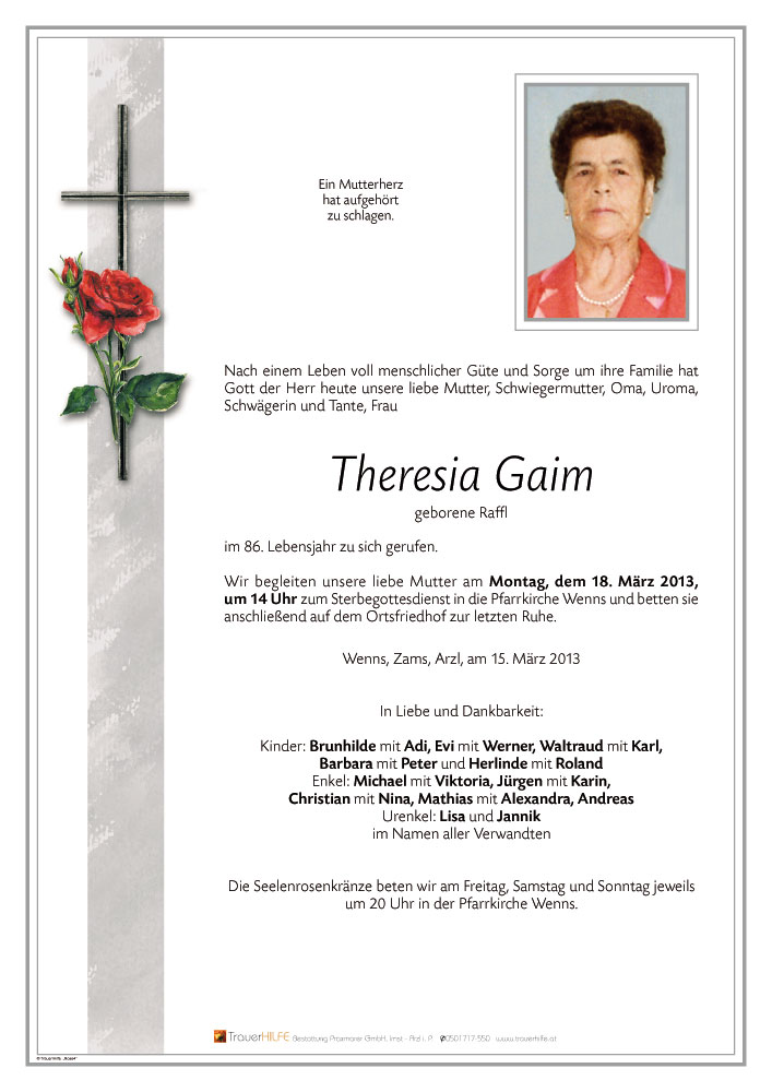 zum Ableben eurer lieben Mutter unsere aufrichtige Anteilname. Gerne erinnern wir uns zurück und werden unsere liebe Theresia in liebevoller Erinnerung behalten. Familie Deutschmann Perg</p>