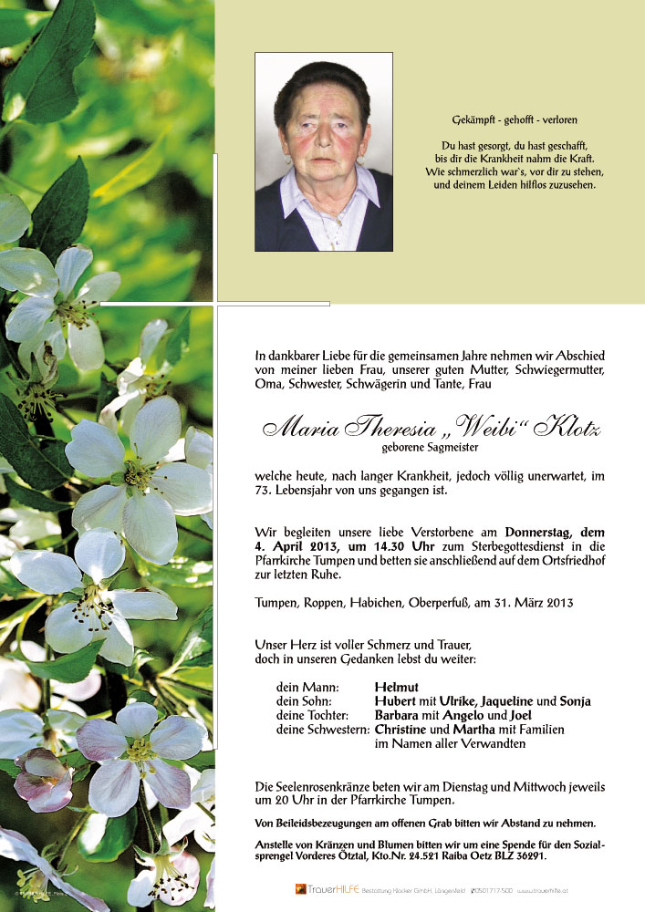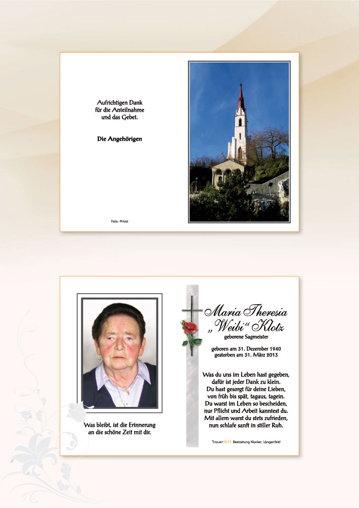 Neue Kerze für Maria Theresia Weibi Klotz entzünden.