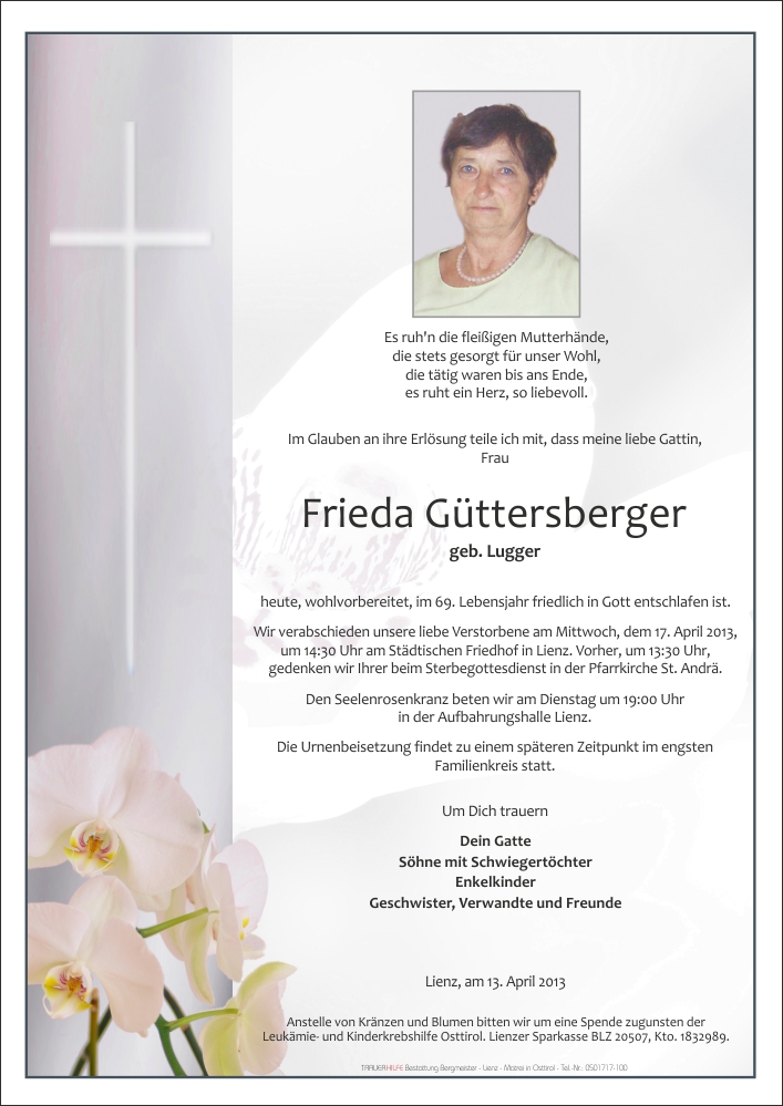 Als Gott sah, dass der Weg zu lang, der Hügel zu steil,das Atmen zu schwer wurde, legte er seinen Arm um Frieda und sprach: Komm heim.
