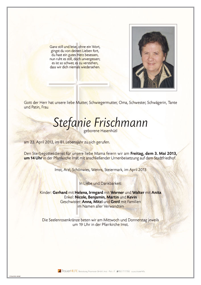 Liebe Steffi! Da, wo du jetzt bist, geht es dir bestimmt gut und du fühlst dich wohl. Deiner Familie wünsche ich viel Kraft in dieser schweren Zeit. In einem stillen Gebet sind wir bei EUCH. Hildegard mit Familie27.04.2013 18:48 - Hildegard Haid