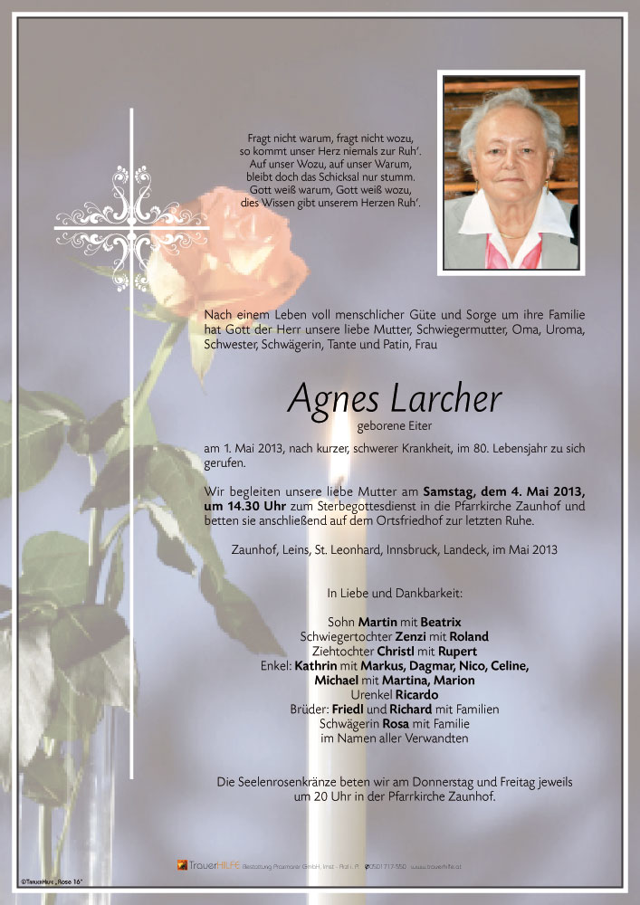 So schnell ist Agnes ihrem Mann gefolgt - als hätte er sie bei der Hand genommen... das ist schwer für die Menschen, die zurückbleiben. Wir wünschen Euch allen von Herzen Trost und Zuversicht. In liebevoller Erinnerung - Trudi und Rupert Melmer</p>