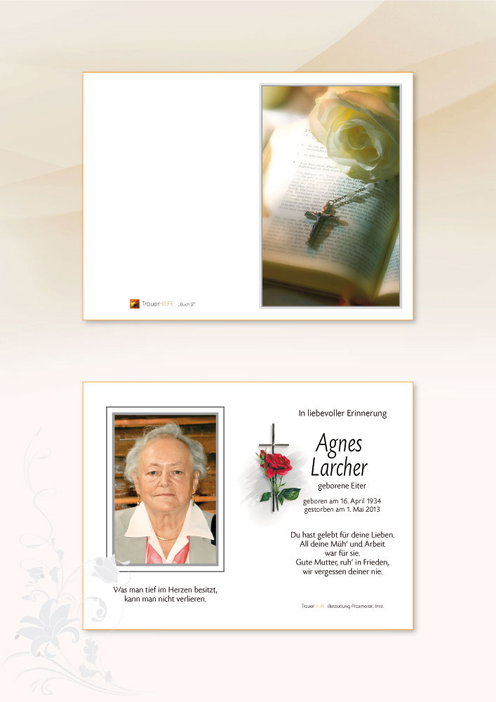 Wie dornenreichwar deines Lebens Bürde,Wie tränenreich dein teures Mutterherz!Du trugst das Leben christlich still, mit Würde,du warst in Gott ergeben auch im Schmerz.Ein Trost nur ist:Wir seh‘n uns einstens wieder und werden dauernd dort vereinigt sein.