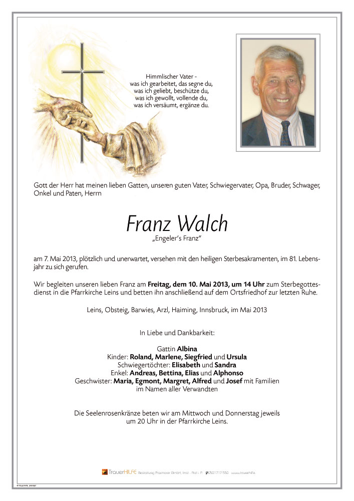 Möge Euch die Erinnerung an Euren lieben Vater Franz begleiten wie ein wärmender Sonnstrahl.