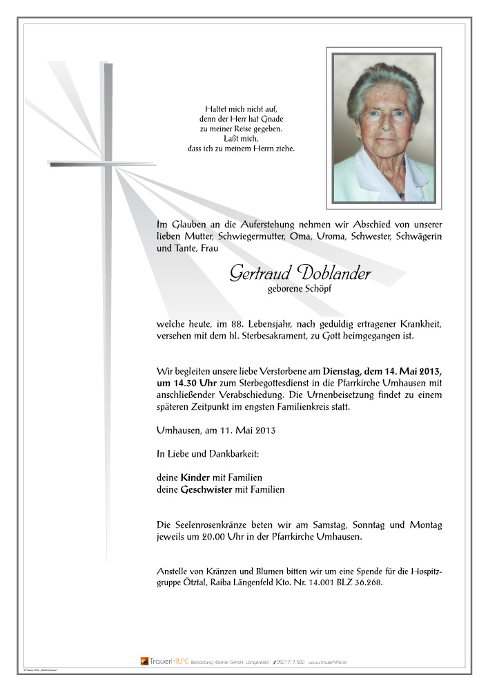 Der irdische Lebensweg eurer Traudl ist zu Ende. Möge der Herr sie nun hin- und hineinführen in seine ewige Heimat.