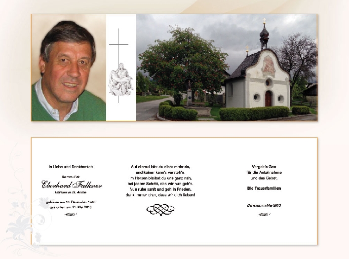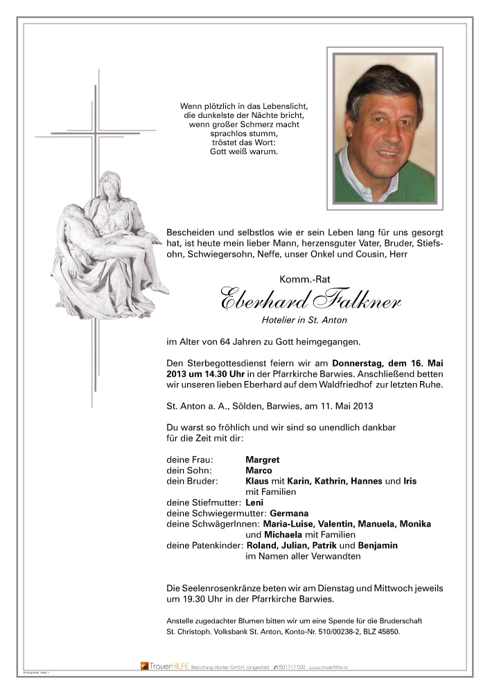 Ich entbiete euch meine aufrichtige Anteilnahme am schmerzlichen Tod von Eberhard und wünsche euch Gottes Segen und Kraft in dieser so schweren Zeit.15.05.2013 07:03 - Roswitha Jehle, St.Jakob