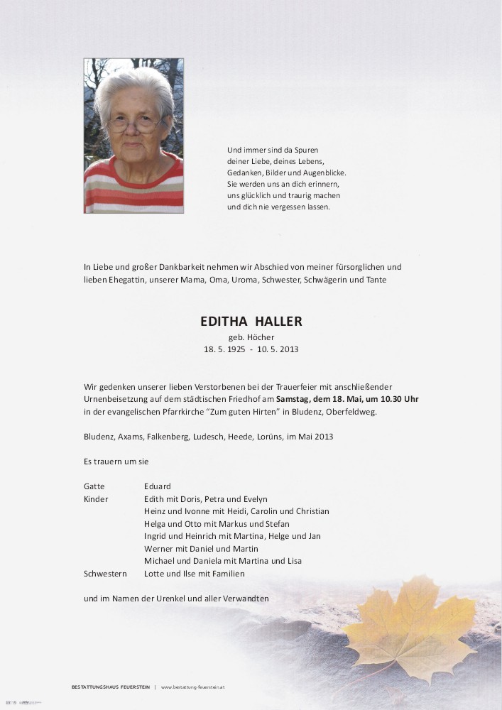 Bestattung wurde durchgeführt von: Christoph Feuerstein Bestattung Christoph Feuerstein Sturnengasse 26 6700 - Bludenz Tel.: 05552 62079-0 zum Bestatter