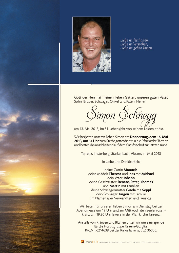 Ihr habt in den letzen Jahren für Simon wahr Größe erwiesen und habt ihn liebevoll umsorgt, gepflegt und für ihn die Hoffnung weiter getragen.