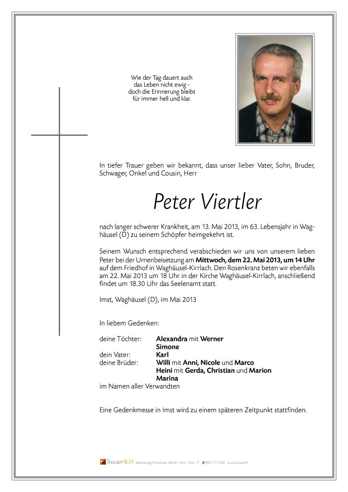 Bestattung wurde durchgeführt von: Daniel Klocker Bestattung Praxmarer GmbH Thomas Walch Str. 4 6460 - Imst Tel.: 05412 64250 zum Bestatter
